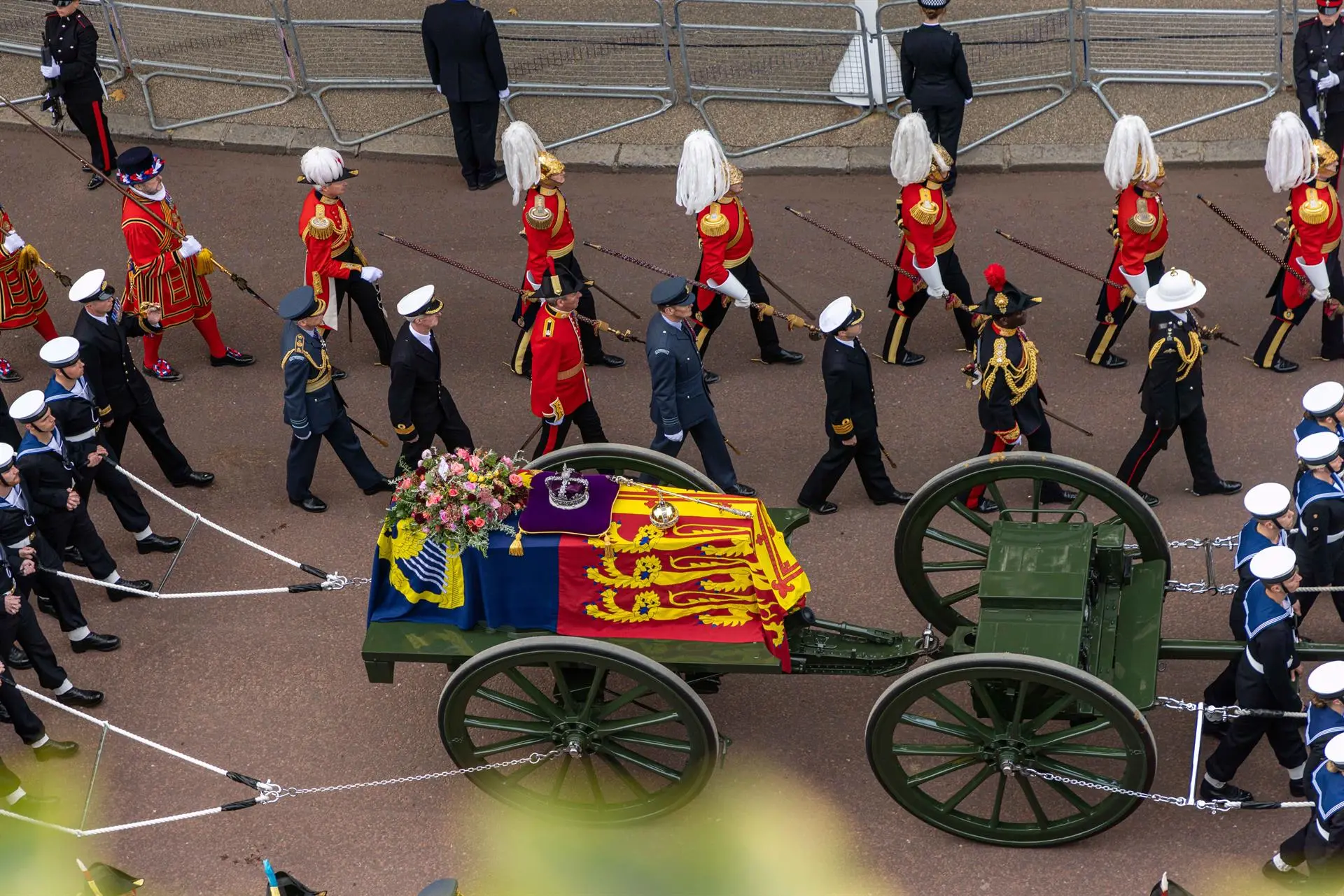 Una tarjeta escrita a mano sobresalía encima del féretro, entre la corona imperial, el orbe real y el cetro de oro: “En memoria amorosa y devota”. Firmado: “Charles R”, el primogénito de la difunta y nuevo soberano, Carlos III.