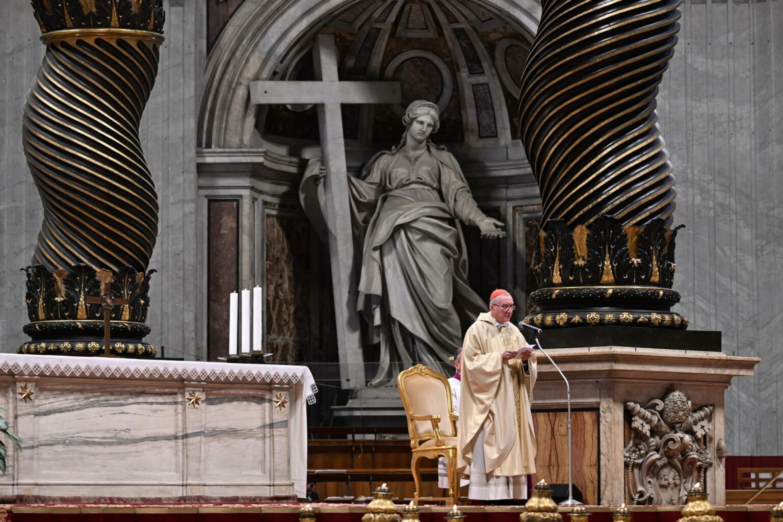 La eucaristía fue presidida por el secretario de Estado vaticano, el cardenal Pietro Parolin, desde el altar papal de la basílica, pese a la ausencia de Francisco, que prosigue su convalecencia en su residencia vaticana, la Casa Santa Marta, después de pasar 38 días hospitalizado por sus problemas respiratorios.