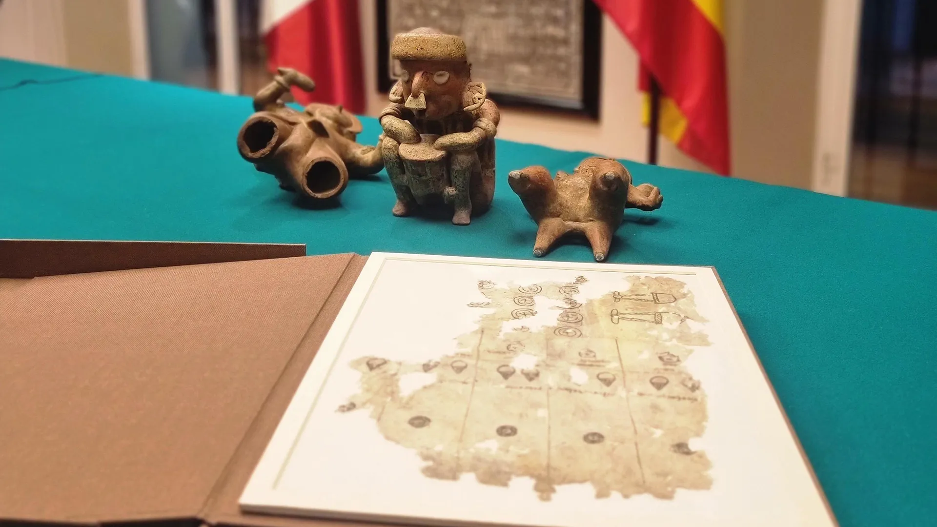 Estas piezas estaban en posesión de la ciudadana española Carmen Celda, quien las encontró tras el fallecimiento de su padre y las entregó voluntariamente a la Embajada en 2022 para su restitución.