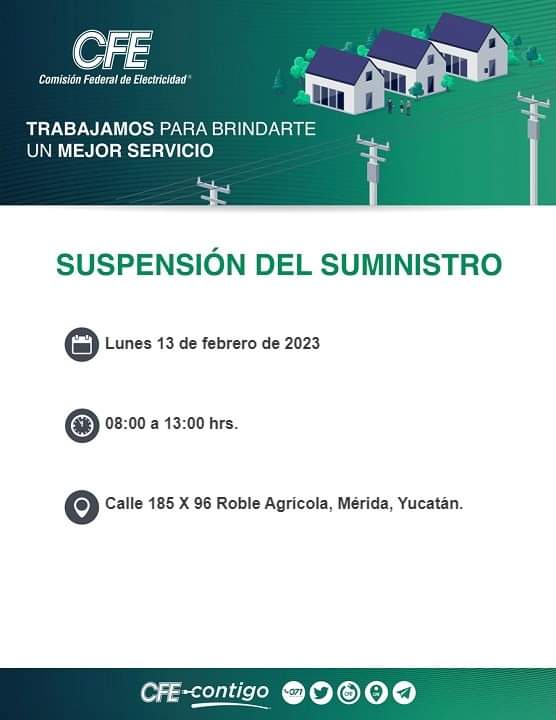 De acuerdo con lo publicado por la división peninsular de la Comisión Federal de Electricidad, la suspensión del suministro en la colonia Roble Agrícola en la ciudad de Mérida.