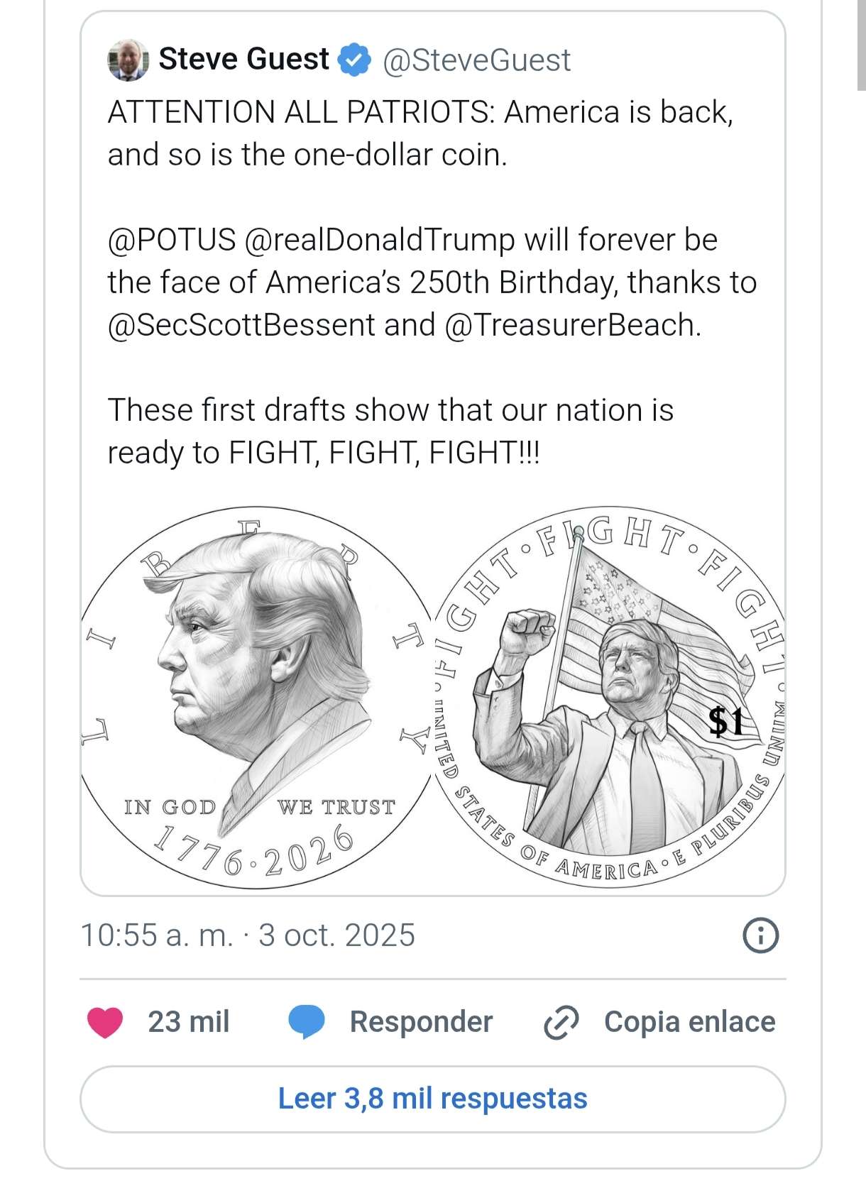 La Administración del presidente Donald Trump, que busca una renegociación bilateral del T-MEC, informó este viernes que considera emitir una moneda de un dólar con el rostro del mandatario para conmemorar el 250 aniversario de la independencia de Estados Unidos.