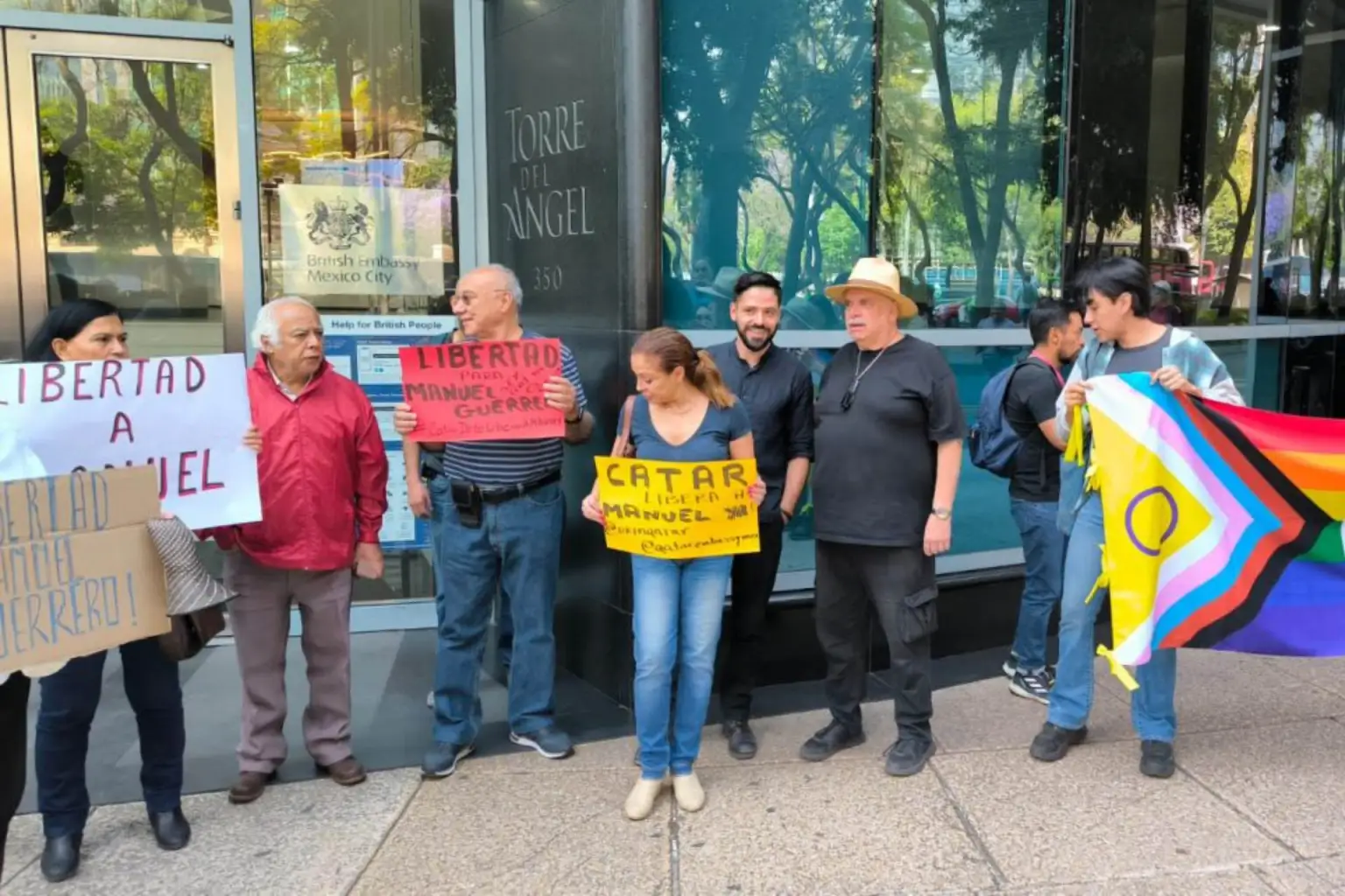 A un mes de que Manuel Guerrero fuera detenido en Qatar por su orientación sexual, familiares y defensores de derechos humanos se manifestaron este lunes frente a la Embajada Británica en México para exigir su liberación.