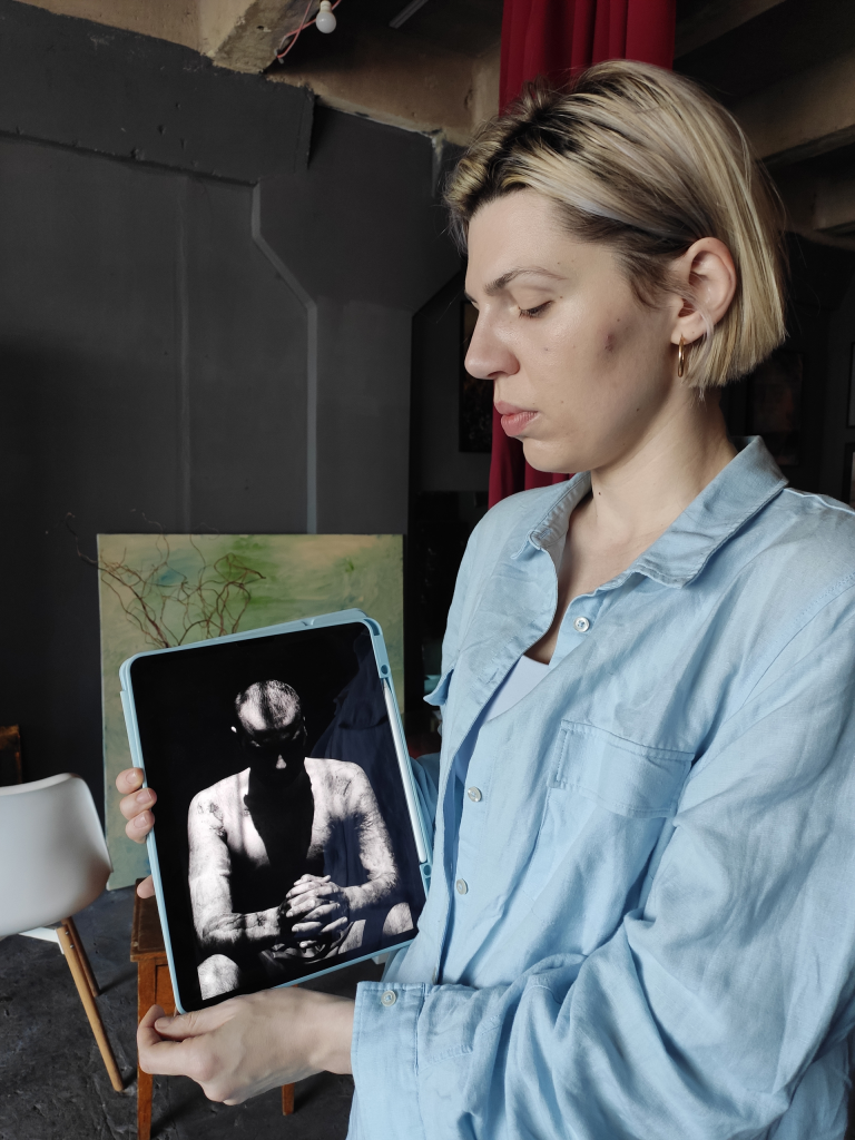 Contribuyó a su tarea un primer modelo, Oleksandr Teren, quien se alistó en el ejército a raíz del inicio de la invasión rusa. Volvió con las dos piernas amputadas por debajo de las rodillas, tras un bombardeo en la región de Jarkov del pasado agosto.