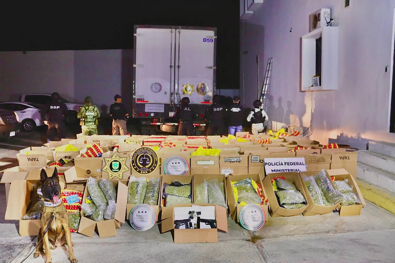 Más de 800 kilogramos de cannabis transportaba un camión tipo Torton que fue detenido anoche en la carretera Campeche-Mérida por elementos de fuerzas estatales y federales.