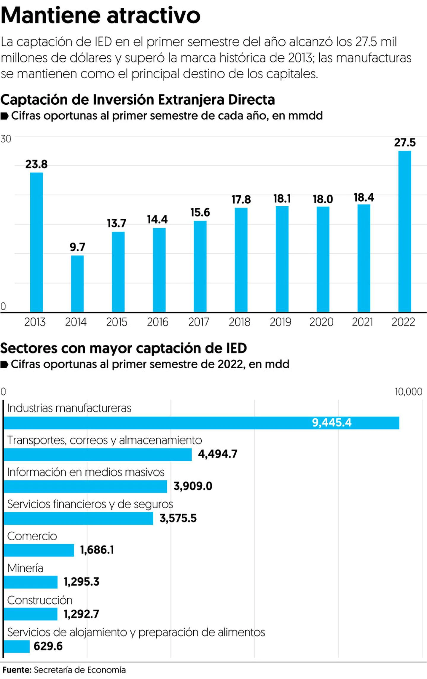Los sectores de manufacturas, transportes e información en medios masivos captaron el 65 por ciento de la IED del primer semestre de 2022, mientras que los servicios financieros y de seguros captó 13 por ciento.
