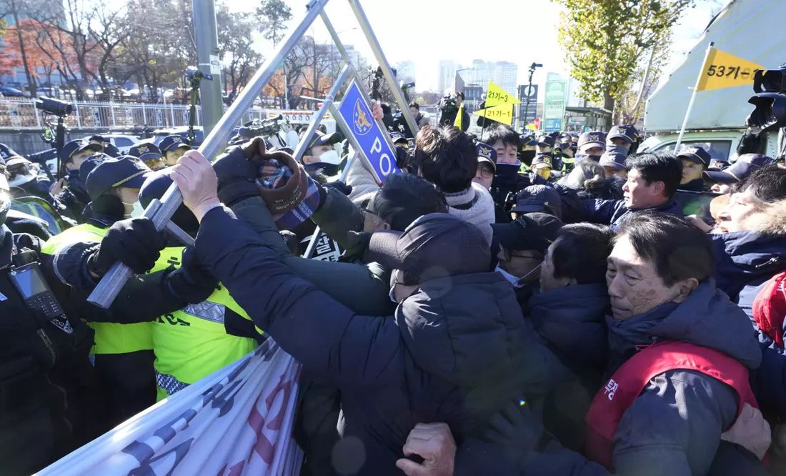 Docenas de criadores de perros de Corea del Sur chocaron con la policía frente a la oficina presidencial este jueves al protestar contra la presión de las autoridades para prohibir el consumo de carne de perro.