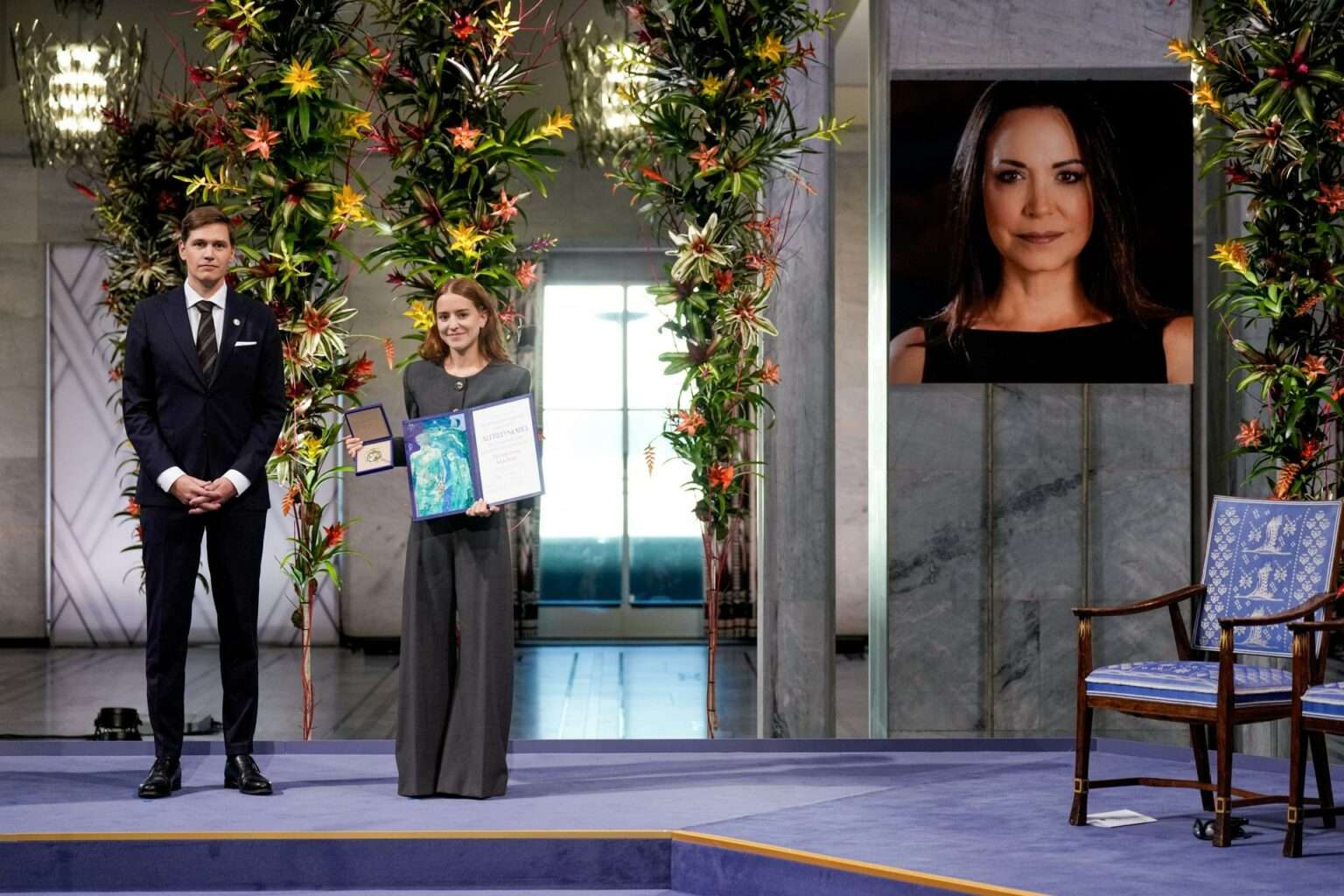 Ana Corina Sosa, hija de María Corina Machado, recibió en el Ayuntamiento de Oslo el Nobel de la Paz 2025 en nombre de la opositora venezolana, quien no pudo viajar a Noruega a tiempo para recibir en persona el premio, aunque viajará igualmente a la capital noruega, según el Instituto Nobel.