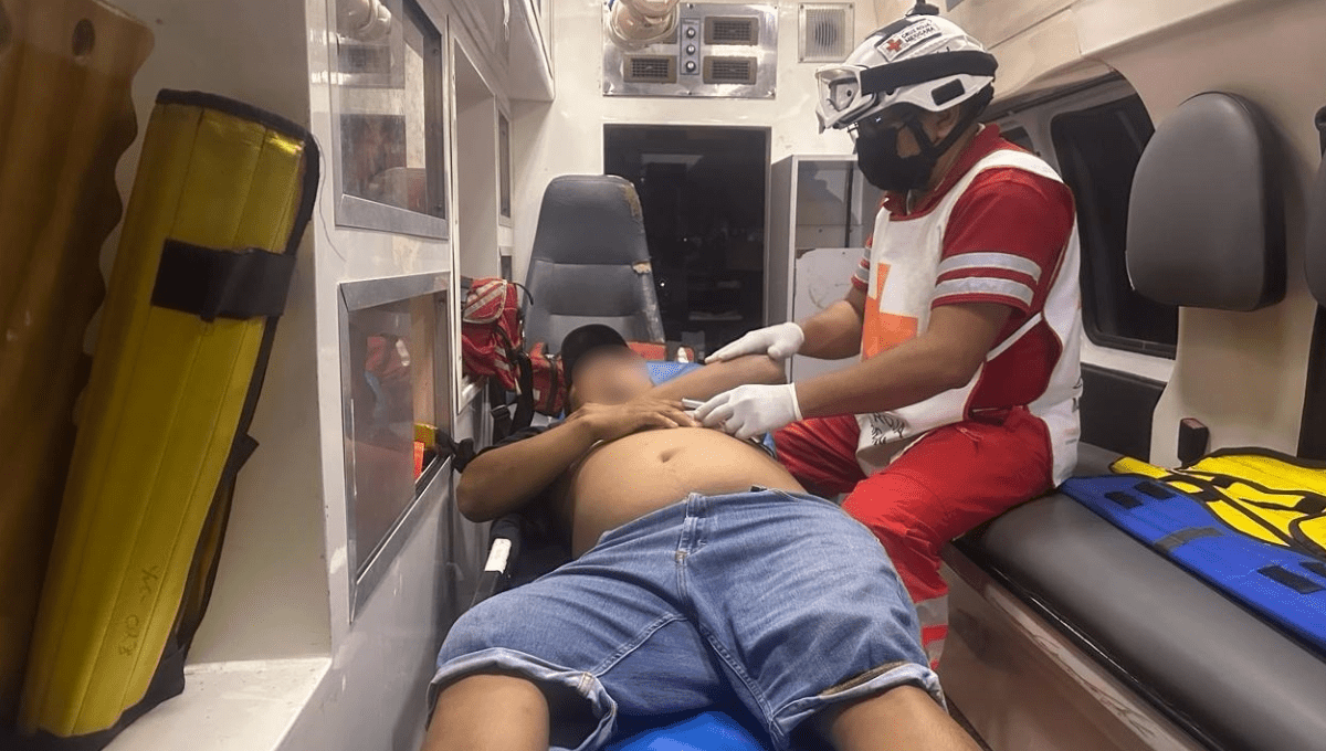 Arribó la ambulancia de la Cruz Roja YUC-022, al mando del paramédico Santos Euán, quien informó que el afectado padeció dos heridas penetrantes por arma blanca, una de aproximadamente tres centímetros y otra de 0.5 centímetros, por lo que fue trasladado al Hospital General San Carlos.