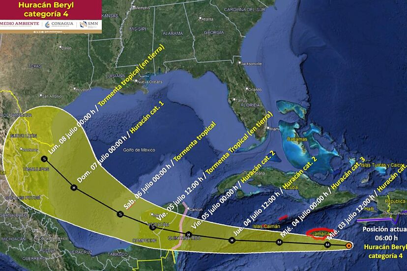 Hasta el corte de las nueve de la noche del pasado 3 de julio, el Huracán Beryl de categoría 4 en la escala Saffir Simpson mantiene su trayectoria hacia la Península de Yucatán.