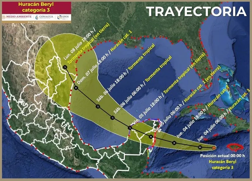 ⚠️? #Beryl ahora como #Huracán de categoría 3 en la escala #SaffirSimpson, mantiene su trayectoria hacia la #PenínsulaDeYucatán.