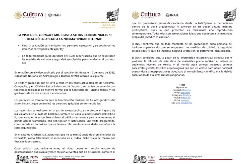Ante ello, el INAH reveló un comunicado donde aclara que durante la visita y grabaciones con Mr. Beast se hizo con todos los protocolos de seguridad y conservación para no afectar de ninguna manera las zonas arqueológicas y naturales de ambos estados. Indicando también que la visita se hizo de la mano de expertos que acompañaron y guiaron al youtuber y a su equipo durante todos los recorridos y grabaciones.