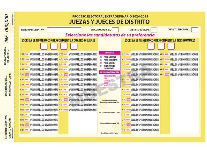 El tamaño carta será para los 81 candidatos a ministros de la Suprema Corte de Justicia de la Nación. En una parte de la hoja estarán los nombres de las mujeres y el ciudadano tendrá que colocar cinco números que correspondan a sus elegidas; en otra cara de la papeleta estarán los candidatos y los ciudadanos tendrán que colocar cuatro números correspondientes a sus elegidos.