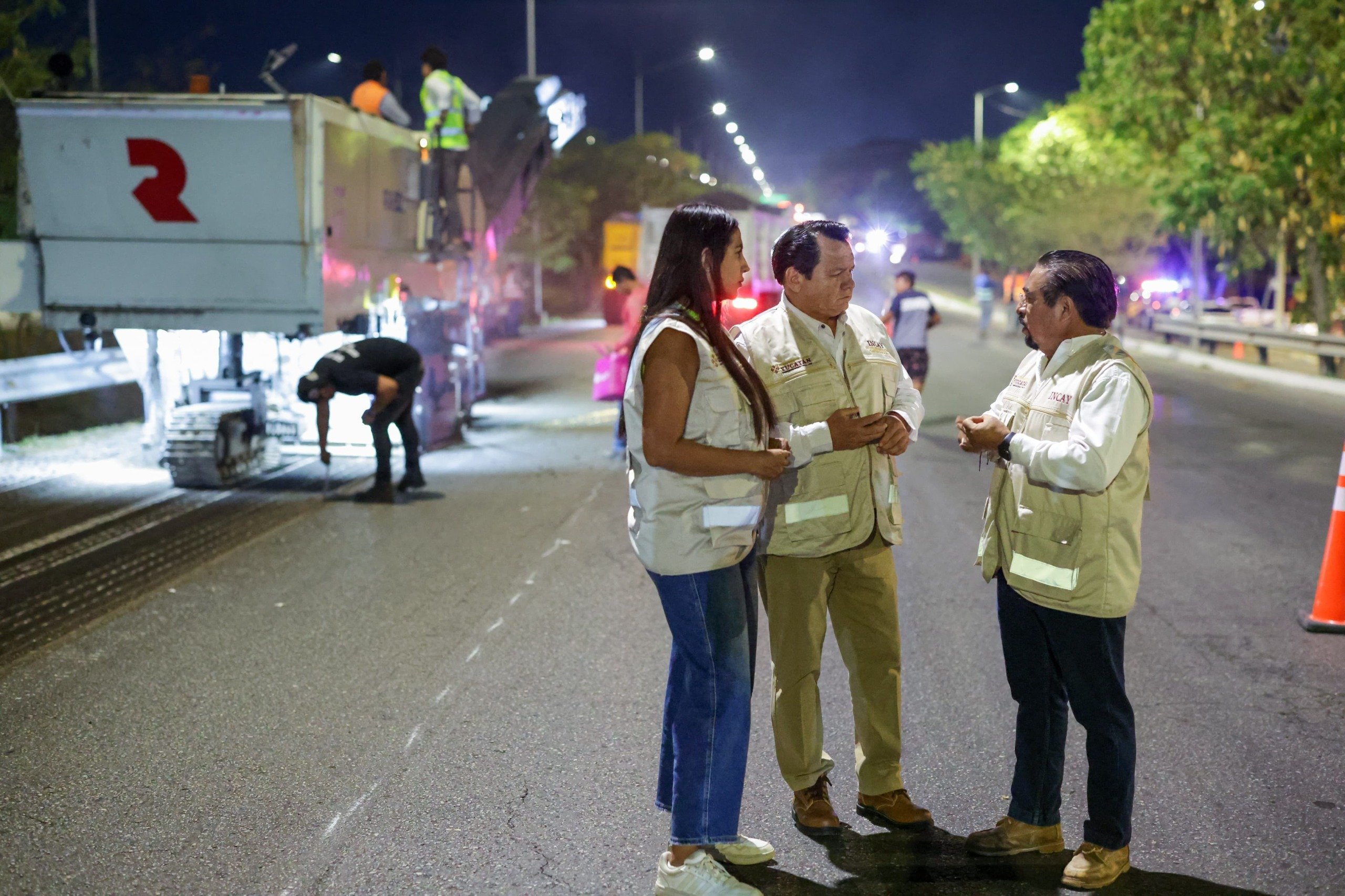 En la noche del lunes, en el kilómetro 11+400 del anillo periférico de Mérida, el Mandatario estatal supervisó el inicio de los trabajos que incluyen recompactación, bacheo y renivelación con concreto asfaltico en caliente de hasta 4 cm de espesor compacto en los tramos que se requieran.