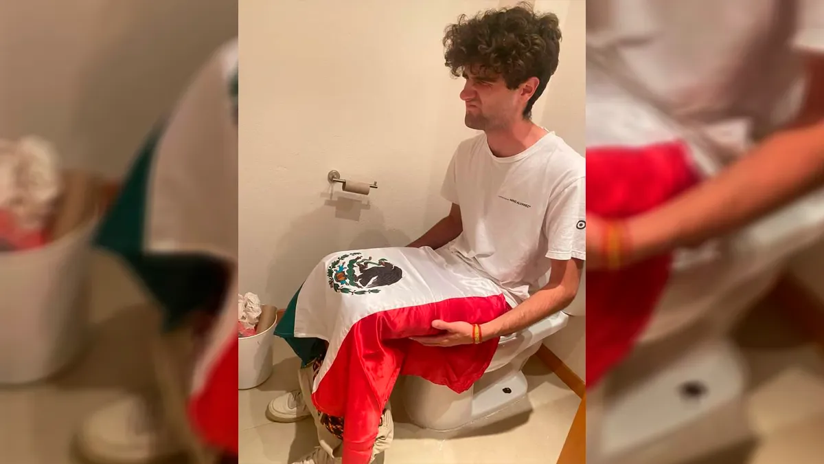 Asimismo se dio a conocer la fotografía de un estudiante sentado en una taza de baño y cubriéndose las piernas con una Bandera de México.