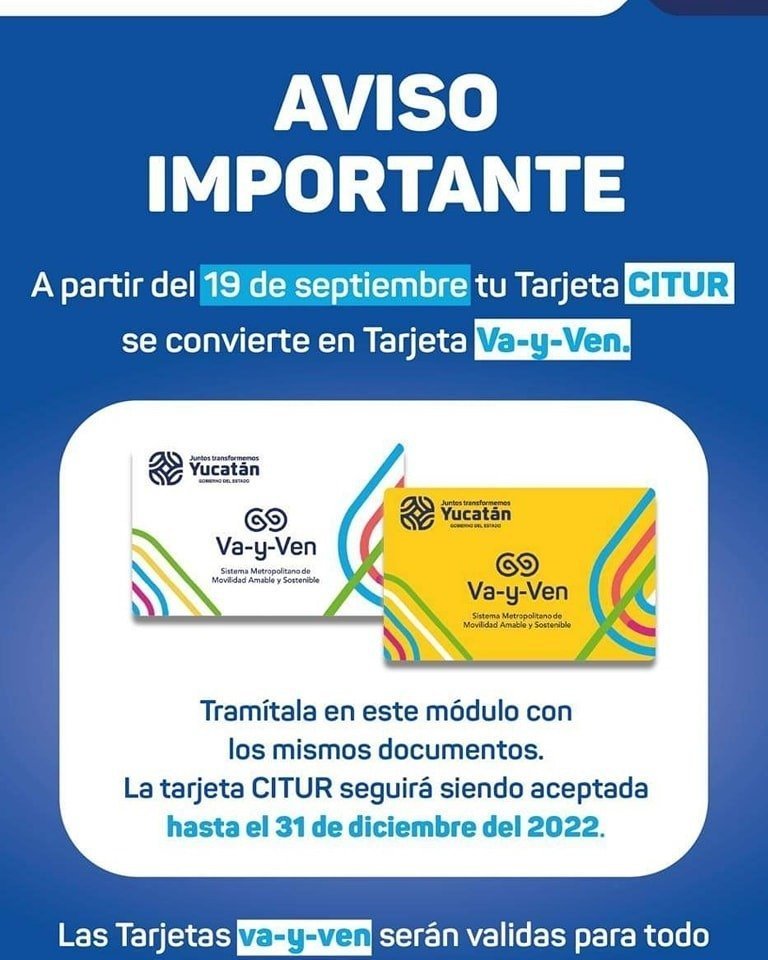 “Tu tarjeta CITUR se convierte en tarjeta inteligente «Va y Ven». Las credenciales CITUR continuarán siendo aceptadas en el transporte público hasta el 31 de diciembre.”