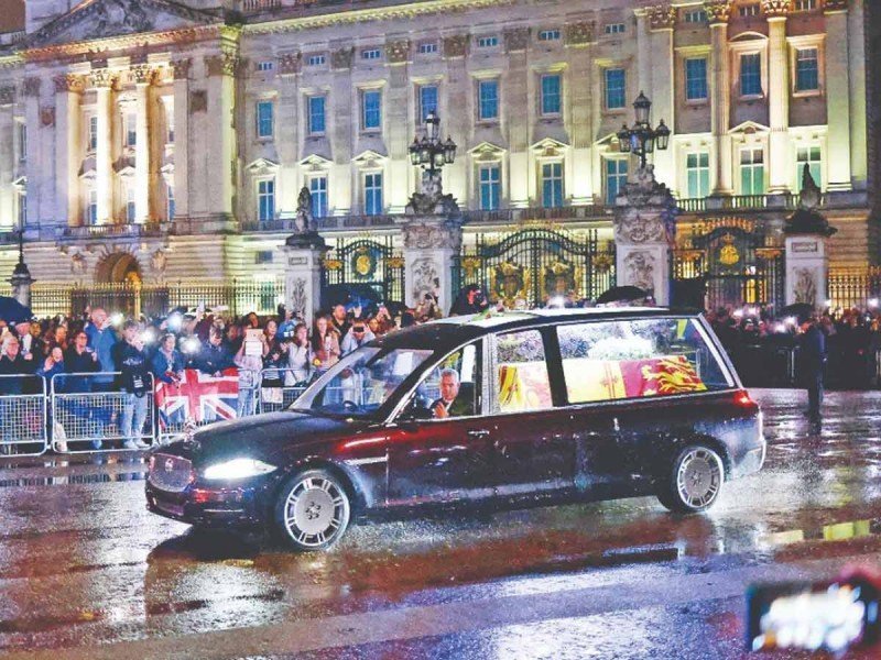 El vehículo portando el féretro de roble, cubierto con un estandarte y una corona de flores blancas, ingresó al Palacio de Buckingham, donde la reina Isabel II vivió con su familia durante décadas