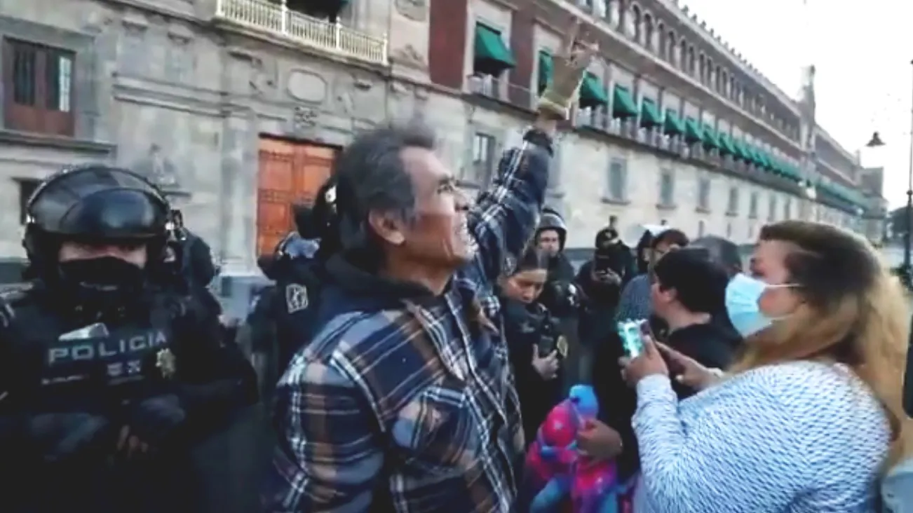 Un manifestante se saltó las vallas que rodean Palacio Nacional y animó a sus acompañantes a hacerlo también. Incluso derribó algunas estructuras.