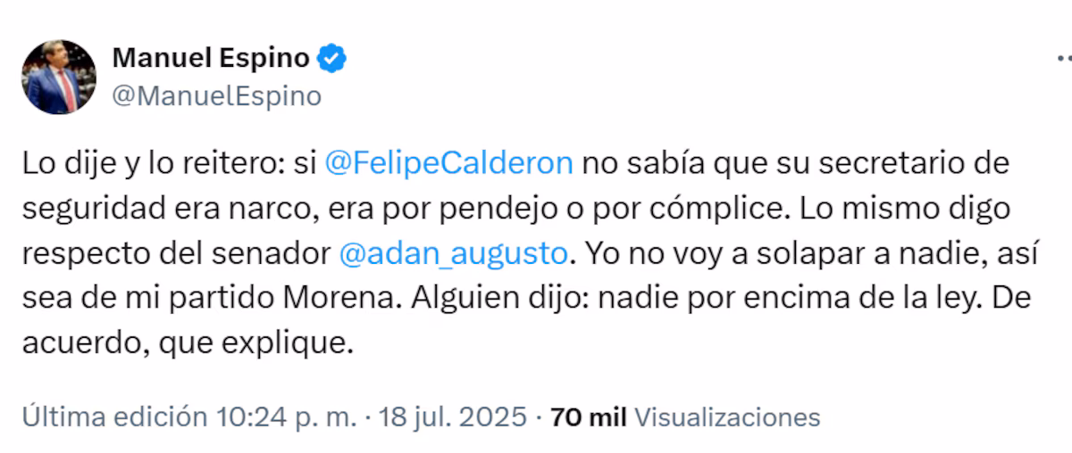 “Lo dije y lo reitero: si Felipe Calderón no sabía que su secretario de seguridad era narco, era por pendejo o por cómplice. Lo mismo digo respecto del senador Adán Augusto”, escribió Manuel Espino en una publicación en X.