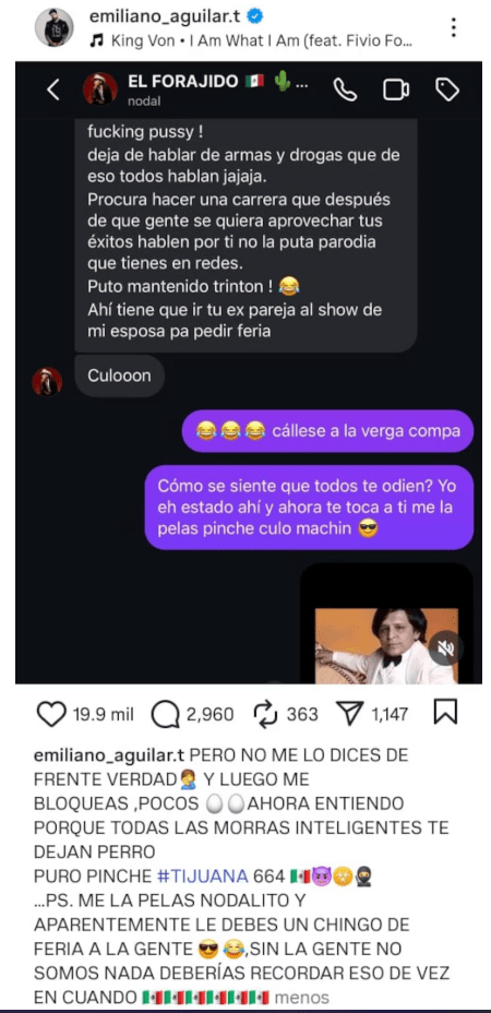 Aparentemente, Christian Nodal intervino. En la imagen difundida por Emiliano en Instagram, el sonorense le escribe para reclamarle y, a la vez, minimizar su incipiente carrera en el rap y el hip hop: “Fucking pussy, deja de hablar de armas y drogas que de eso todo hablan jajaja”.