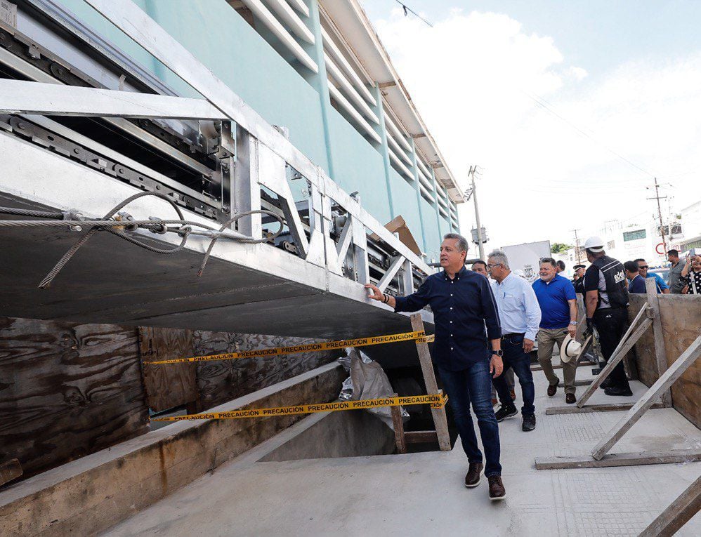 Como parte de las acciones de modernización e impulso de espacios funcionales e inclusivos en el municipio, el alcalde Alejandro Ruz Castro supervisó los avances en la instalación de la nueva rampa eléctrica en el mercado Lucas de Gálvez que mejorará el acceso a personas con discapacidad y adultos mayores.