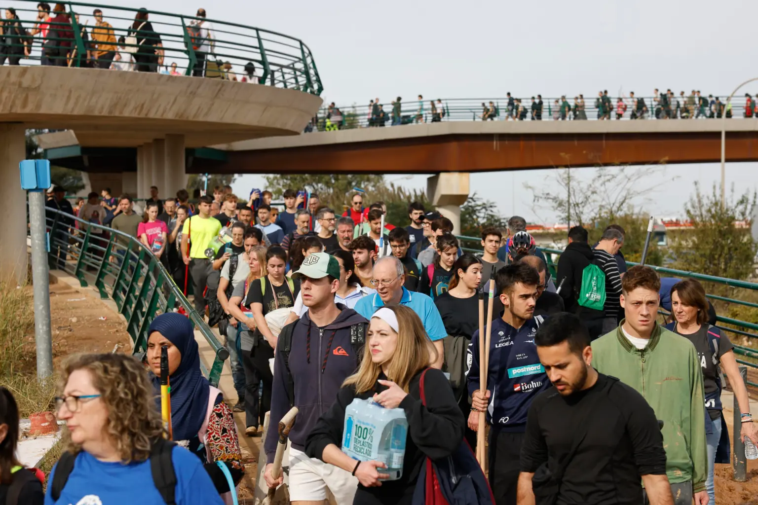 Esta situación ya ocurrió en la tarde de este jueves, cuando cientos de personas cargadas con comida, agua y palas cruzaron el puente peatonal para ayudar en el barrio de La Torre, el más afectado de la capital por la dana que ha asolado la provincia esta semana.