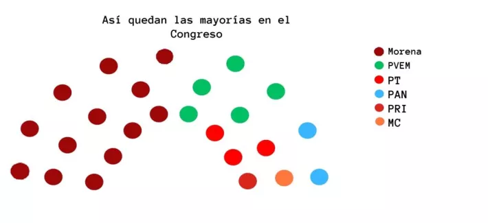 El Congreso quedará estructurado de la siguiente forma para el periodo de 2024-2027: Morena con 13 curules; el PVEM con cinco; el PT con tres; estos tres partidos conforman la coalición “Sigamos Haciendo Historia” que en conjunto suman 21 de 25 diputados locales. Mientras que la oposición únicamente logró obtener cuatro puestos; el PAN con dos; el PRI con uno y MC con uno.