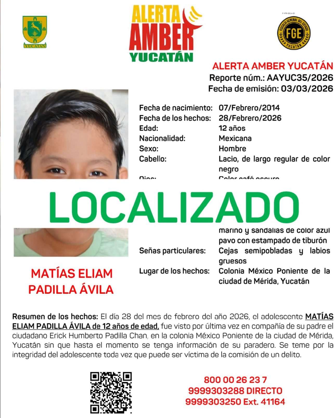 Matías Elías Padilla Ávila regreso a su familia luego de que su madre María Guadalupe Ávila Perez interceptará este martes 28 de abril al Gobernador Joaquín Díaz Mena para solicitar su apoyo para localizar a su hijo que fue supuestamente sustraído por su padre.