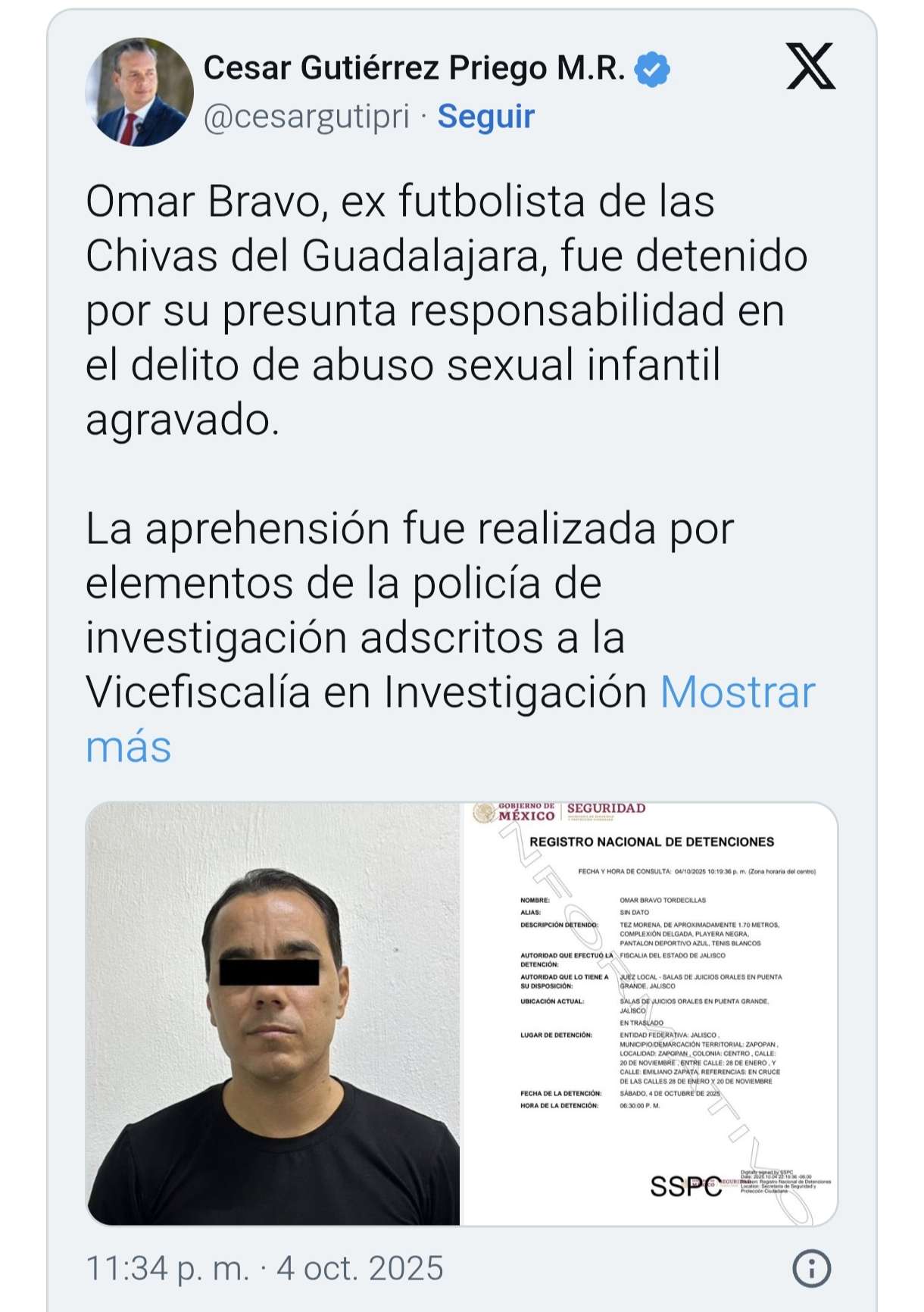 De acuerdo con la ficha del Registro Nacional de Detenciones, el exjugador de Chivas fue detenido este sábado 4 de octubre alrededor de las 18:30 horas en la colonia Centro de Zapopan, Jalisco.