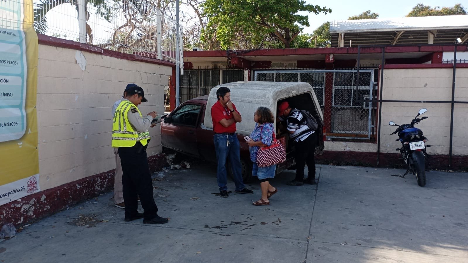 Al entrar a este se fue hacia la barda la cual derribó, el guiador salió del vehículo todo aturdido, los maestros que estaban llegando fueron a ver si estaba bien, el guiador sólo resultó con golpes leves y un gran susto.