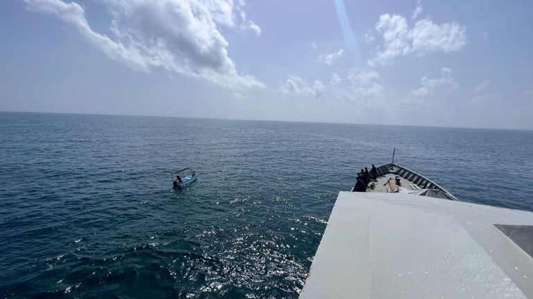 Uno de los navíos que ejerce vigilancia marítima como patrulla costera, logró finalmente avistar a la embarcación menor tipo “boa” de nombre “Chinita”, la cual no poseía matrícula. Destaca que apenas los dos tripulantes a bordo notaron que se acercaba el barco naval, efectuaron señales visuales de auxilio de manera desesperada.