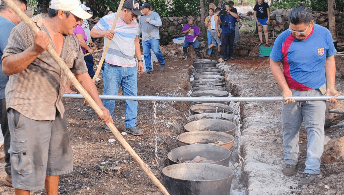 Grandes pailas son colocadas y enterradas en línea por los socios y colaboradores del gremio, mientras que las mujeres preparan los recados, muelen los condimentos y queman el chile.