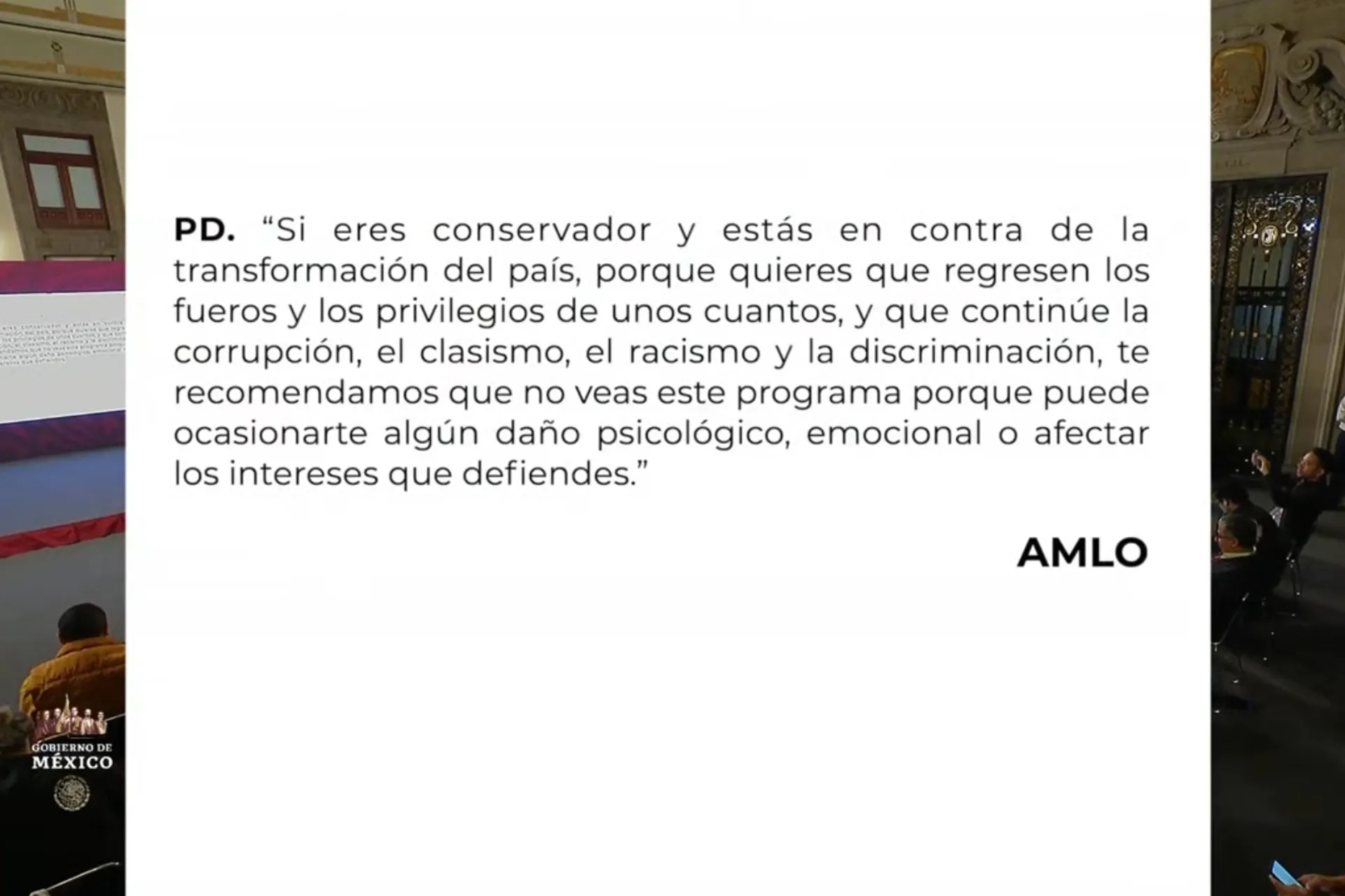 “Si eres conservador y estás en contra de la transformación del país, porque quieres que regresen los fueros y los privilegios de unos cuantos, y que continúen la corrupción, el clasismo, el racismo y la discriminación, te recomendamos que no veas este programa porque puede ocasionarte algún daño psicológico, emocional o afectar los intereses que defiendes“, es el mensaje que ordenó colocar el mandatario mexicano.
