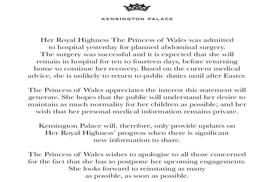 La princesa, de 42 años, fue ingresada en la London Clinic de la capital británica y, según el texto del Palacio real, «se espera que permanezca en el hospital entre diez y catorce días, antes de volver a casa para continuar con su recuperación».