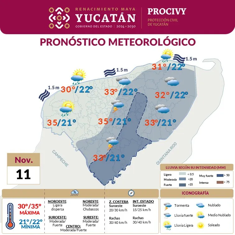 Procivy también informó que, este lunes 11 de noviembre, debido al ingreso de humedad y de la influencia de una vaguada, se espera lluvia ligera dispersa antes del mediodía en algunas regiones del estado, así como chubascos después del mediodía en los municipios del noroeste y suroeste del estado, mientras que en el noreste y sureste se registrará lluvia de intensidad moderada a fuerte a media tarde.