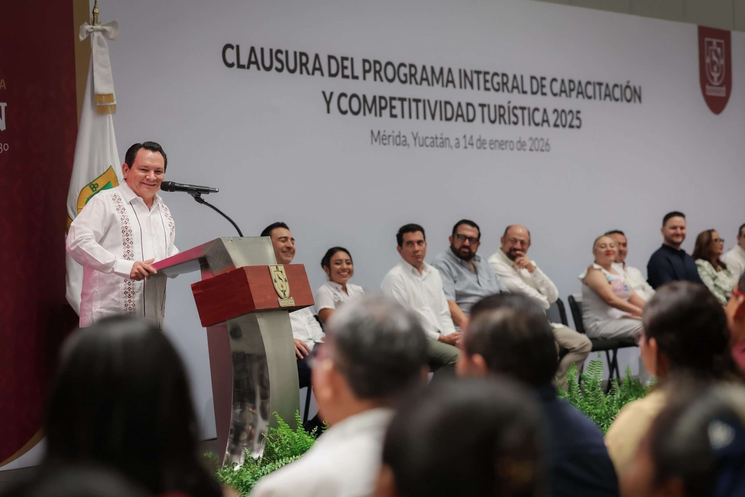 El Gobernador Joaquín Díaz Mena encabezó la ceremonia de clausura y entrega de reconocimientos del Programa Integral de Capacitación y Competitividad Turística (Picct) 2025, en el que más de dos mil prestadoras y prestadores de servicios turísticos participaron para obtener certificaciones que respaldan su profesionalismo y fortalecen la competitividad del sector, con el propósito de seguir impulsando el turismo en Yucatán.