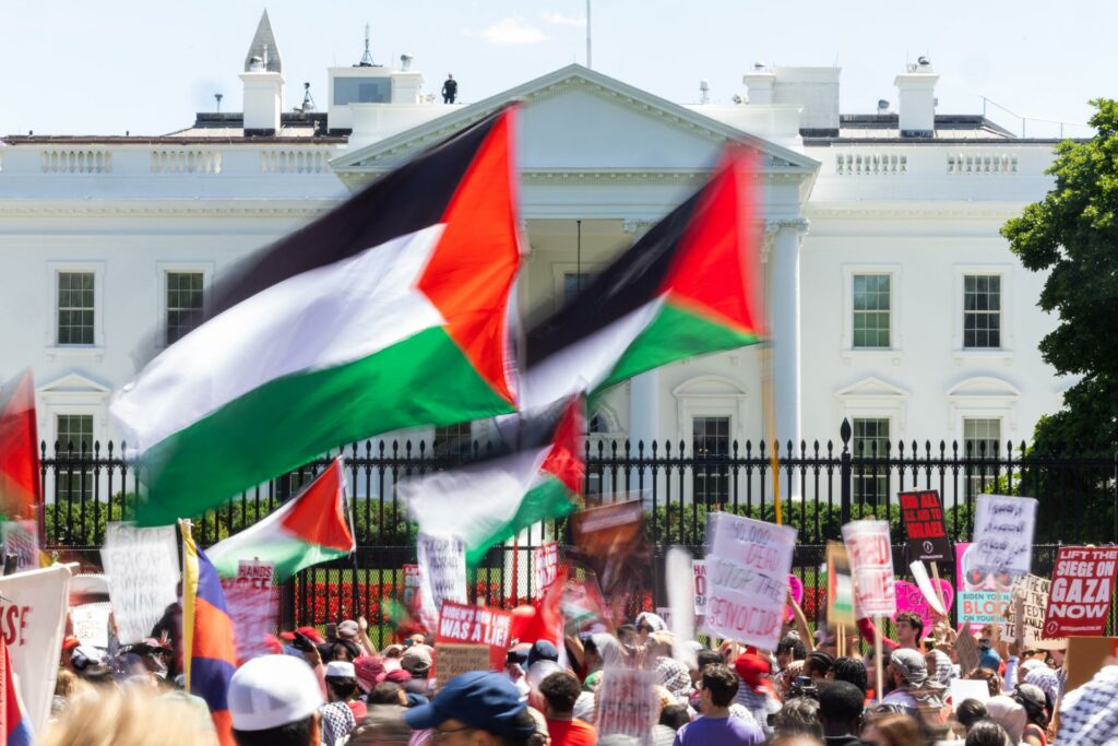 Manifestantes a favor de Palestina protestaron este sábado al mediodía en las inmediaciones de la Casa Blanca.