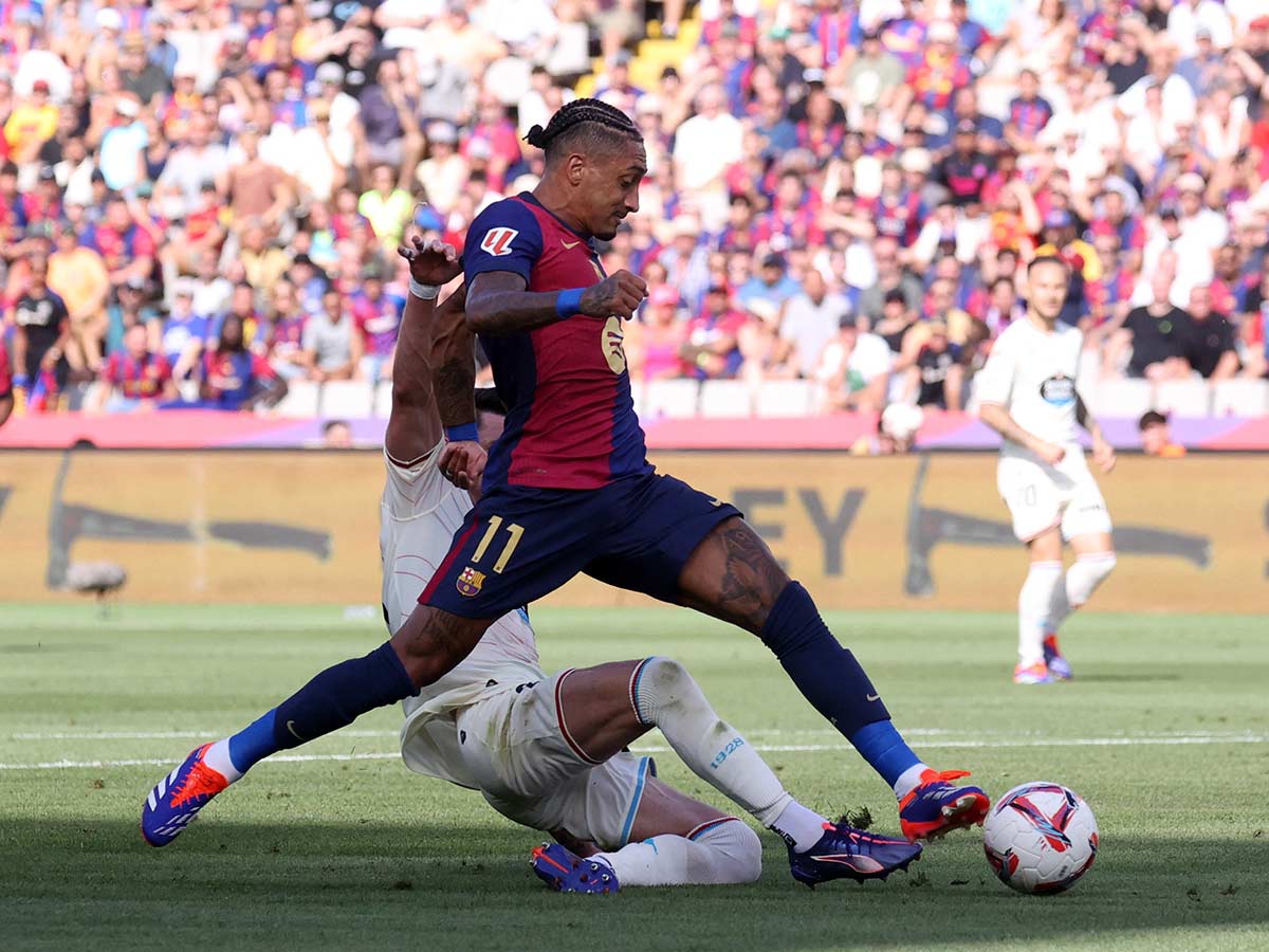Raphinha marcó dos goles para ampliar la ventaja del Barça en el complemento y asistió a Dani Olmo y Ferran Torres para completar la goleada.