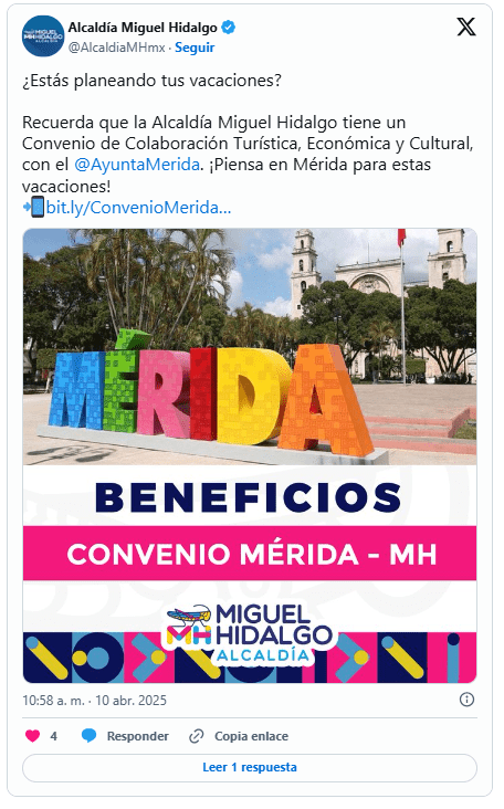 «¿Estás planeando tus vacaciones? Recuerda que la Alcaldia Miguel Hidalgo tiene un Convenio de Colaboración Turística, Económica y Cultural, con el @AyuntaMerida. ¡Piensa en Mérida para estas vacaciones!», publicó en su cuenta oficial de X.