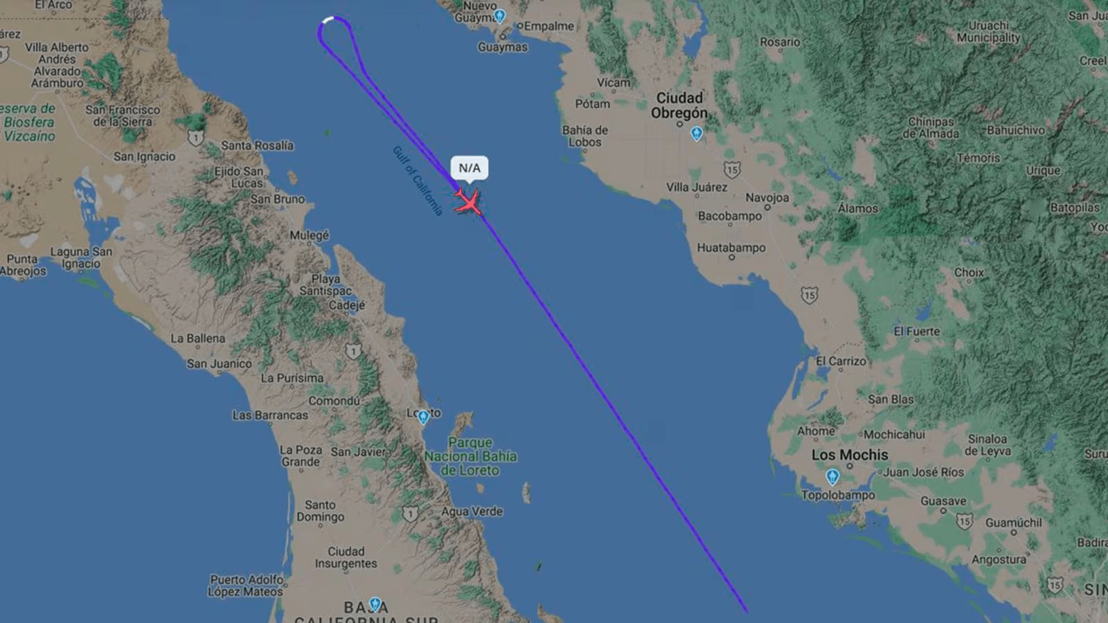 A las 13:41 horas, el Centro de Control de Área Mazatlán informó al Centro Nacional de Vigilancia y Protección del Espacio Aéreo (CENAVI) que detectó un vuelo a 83 km al suroeste de Cabo San Lucas, Baja California Sur, fuera del espacio aéreo mexicano sobre aguas internacionales.