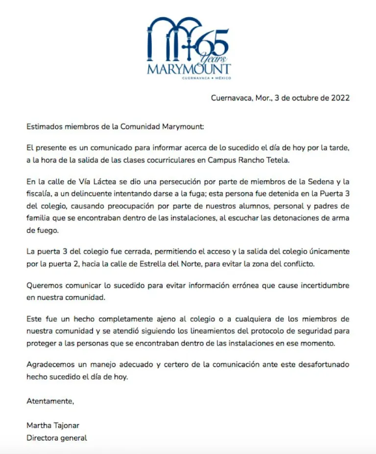 El Colegio Marymount de Cuernavaca confirmó la detención de un sujeto en una de las puertas de su Campus en Rancho Tetela.