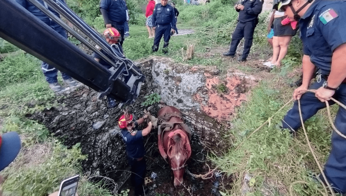 El reporte de un caballo que cayó al sumidero de un predio ubicado en la calle 16 con 37 de la colonia Comichén movilizó a unidades de la Policía Municipal, bomberos e incluso una grúa particular para realizar maniobras de rescate que duraron poco más de una hora.
