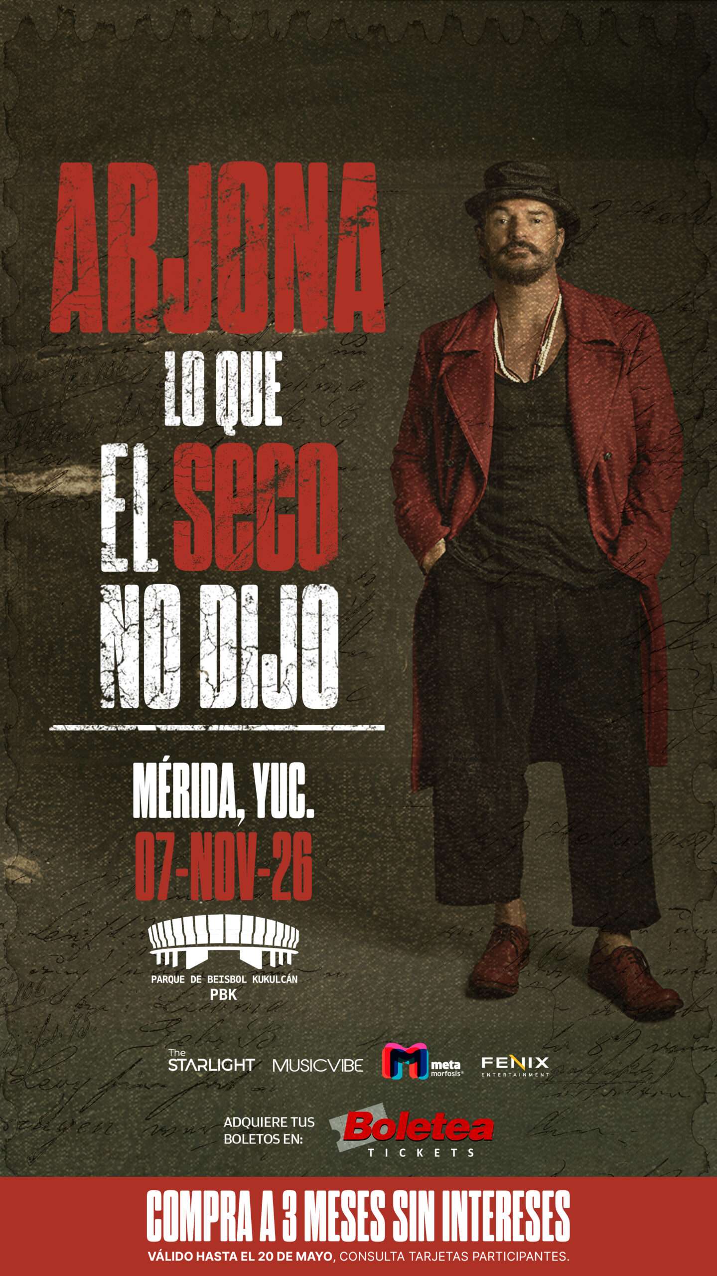 El cantante guatemalteco llegará al Estadio Kukulkán el próximo 7 de noviembre de 2026 como parte de su esperada gira “Lo Que El Seco No Dijo”, una producción de gran formato que promete una noche cargada de emociones, grandes éxitos y una conexión única con su público.