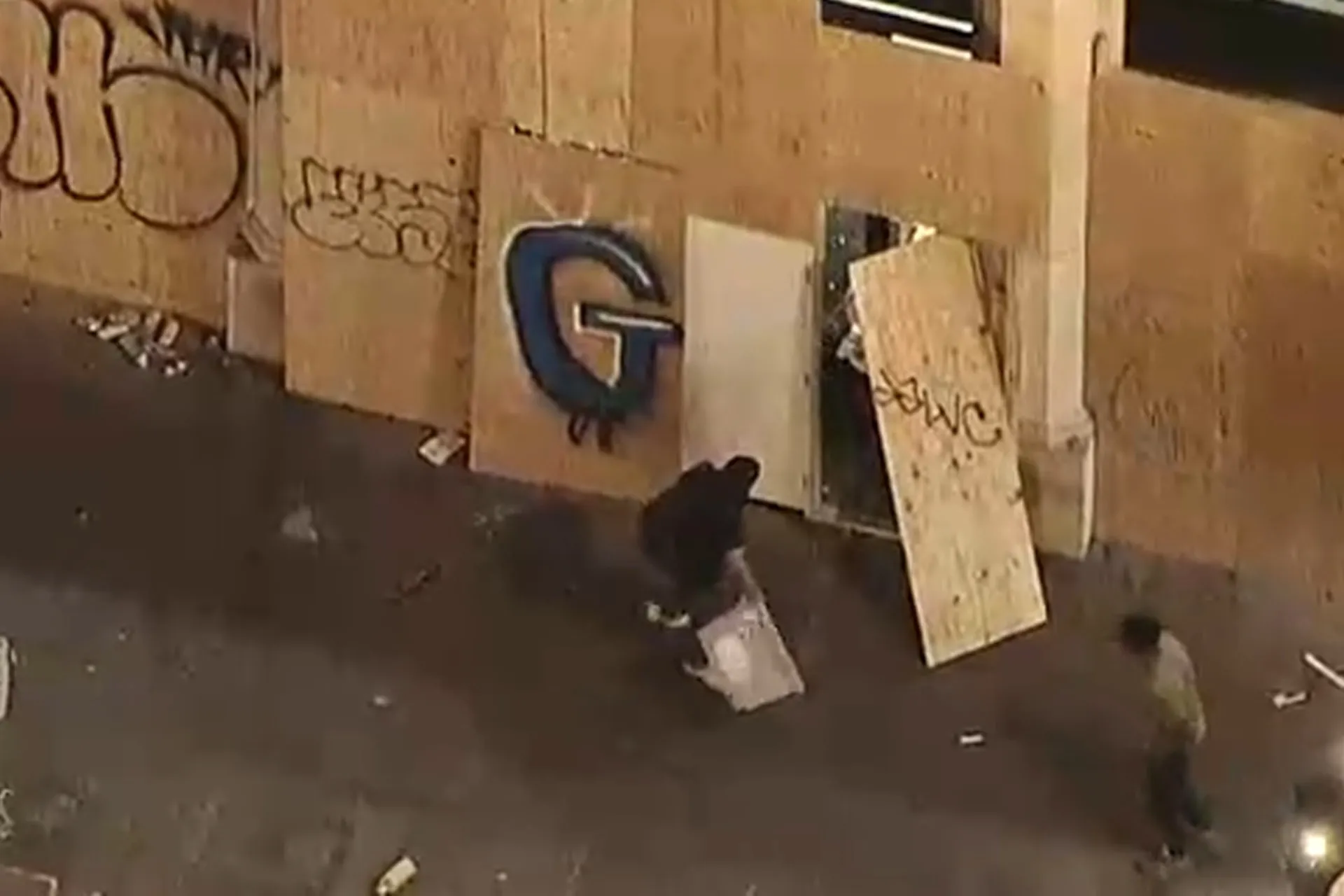 Las autoridades compartieron imágenes de un grupo de personas encapuchadas irrumpiendo a un comercio tras romper una loma de madera que protegía el escaparate y sacando objetos de su interior.