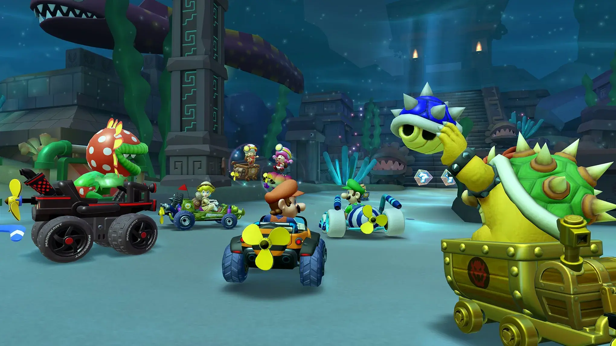 Tal y como podemos confirmar, el juego ha mostrado una nueva pista nunca antes vista en la franquicia: Piranha Plant Cove. Por ahora no sabemos su nombre en español, pero se espera que esté disponible en la nueva temporada que arranca el próximo miércoles y estas son las imágenes publicadas: