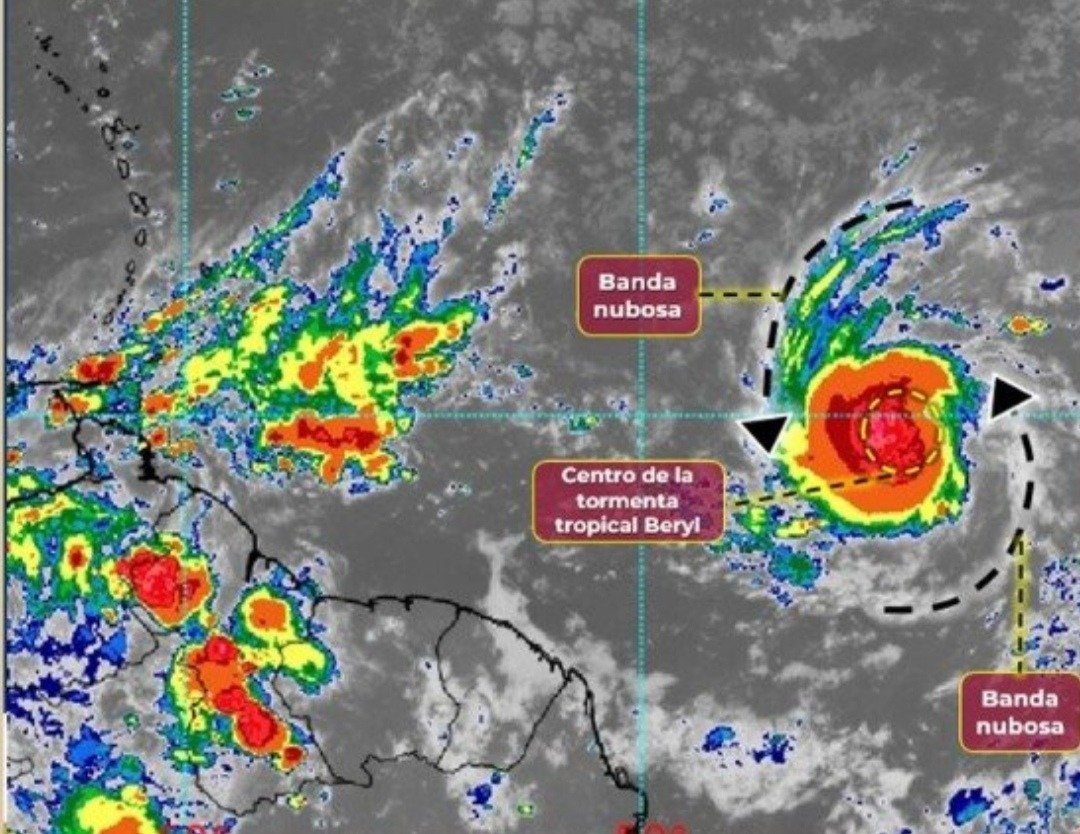 «Beryl» está situado a 4,805 km de las costas de Quintana Roo, informó la Conagua, que agregó que para la noche de este viernes y la madrugada del sábado 29 de junio se prevén lluvias puntuales intensas (de 75 a 150 milímetros mm) en Yucatán.