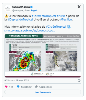 Por medio de un aviso en redes sociales, el SMN indicó que “Alvin” se localiza al sur de las costas de Colima y Michoacán.