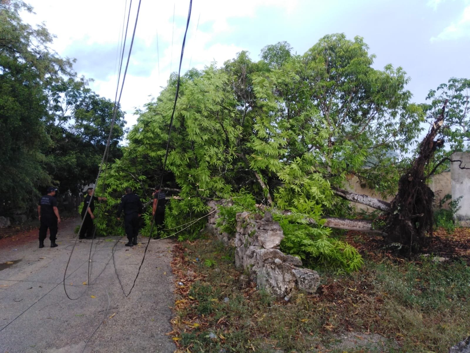 Las personas continúan en su labor de cortar los enormes árboles caídos por la fuerte tromba qué azotó Buctzotz.