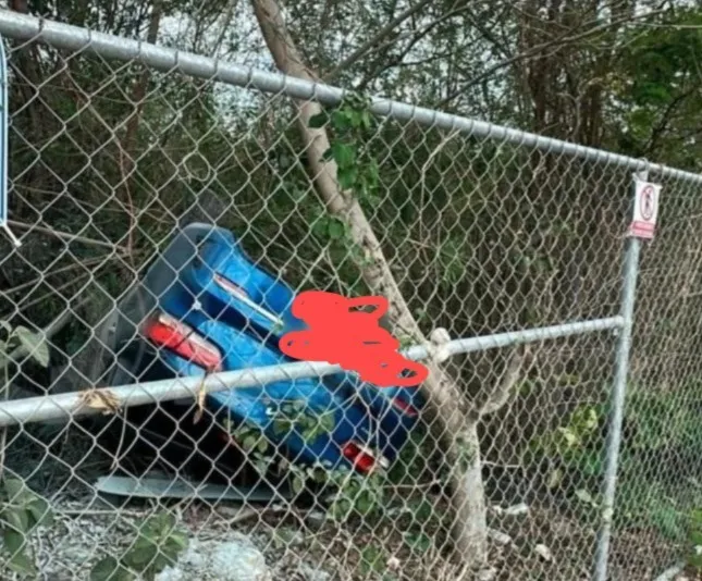 Tras abandonar la carretera, la unidad se proyectó contra una reja que delimita un predio, para después internarse entre la maleza dentro del lugar, donde finalmente quedó volcada.