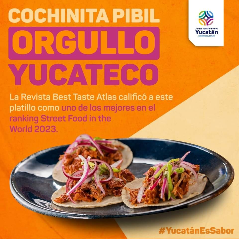 «Les compartimos que la Cochinita Pibil, platillo tradicional yucateco, fue seleccionada entre los 50 mejores platillos del ranking “Street Foods in the World 2023” de la revista Best Taste Atlas (TasteAtlas). En equipo vamos a seguir compartiendo nuestros sabores con todo el mundo, atrayendo turismo que impulsa la economía y los empleos de las familias yucatecas. #YucatánEsSabor_
