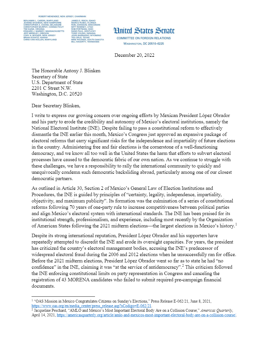 El senador por Nueva Jersey dejó en claro que el “plan B” de Reforma Electoral aprobado por en el Congreso hace unos días “conlleva muchos riesgos para la independencia e imparcialidad de futuras elecciones mexicanas”.